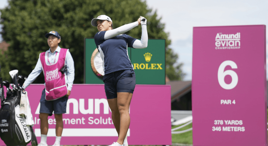 In the third round of the Amundi Evian Championship, Australian Stephanie Kyriacou took the lead with a birdie on the final hole, finishing the day a stroke ahead of Ayaka Furue and Lauren Coughlin. Kyriacou, a 23-year-old from Sydney, shot a 67 in hot and sunny conditions at the Evian Resort Golf Club, bringing her 54-hole total to 14-under-par at the fourth women’s major of the season. She played 19-and-a-half holes on Saturday due to the second round being suspended overnight because of thunderstorms. Kyriacou completed her second round in the morning before taking a nap and then starting her third round five hours later.