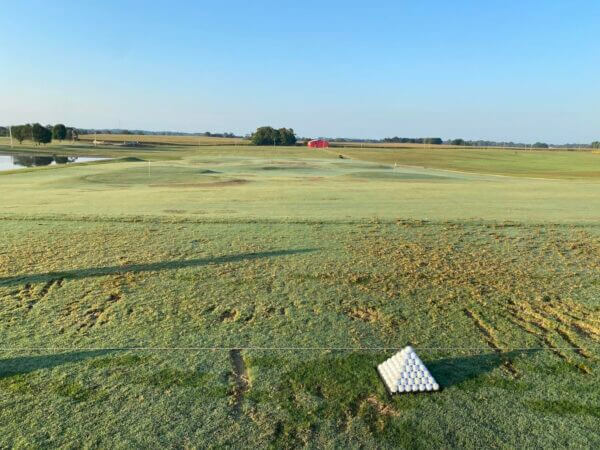 Arriving with the first tee time of the day, you find yourself drawn to the driving range, where an inviting pyramid of untouched golf balls awaits. The silence is only interrupted by the distant sounds of roosters crowing and cows mooing, blending perfectly with the satisfying thwack of club meeting ball. The field stretches endlessly before you, and in the distance, you can spot a quirky red barn adorned with the image of a woolly mammoth—everything you need to know about this underrated golf course.