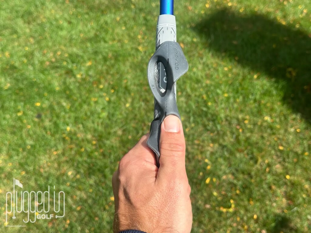 After first using the Golf-Grip with my pitching wedge, I discovered that my grip was more powerful than I realized. This was particularly enlightening when I transitioned to using it with my driver, where my normally comfortable grip sent balls veering off the target line. The feedback from the aid underscored the importance of grip neutrality for maintaining accuracy.