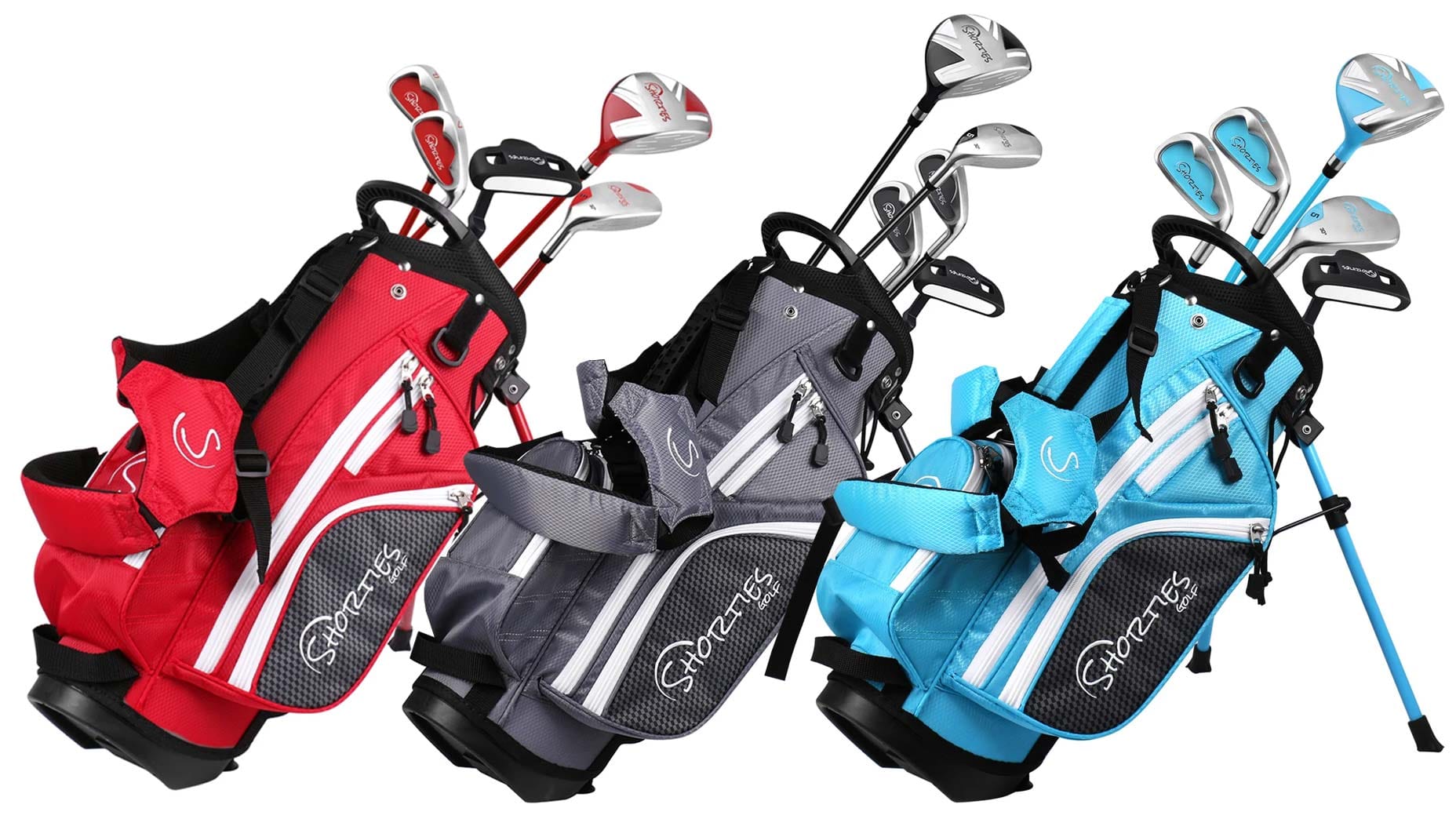 These golf club sets are available in red, blue, gray, and a recently released pink color option. What sets Shorties apart from other children’s golf club sets is the attention to detail in every aspect of the clubs and bags. The bags resemble full-size golf bags, shrunk down to fit smaller golfers, complete with the same types of pockets and materials as adult bags. The stand bags come with a double strap for easy carrying. The clubs in the Tiny model, for golfers 34-38 inches tall, include a driver, 7-iron, putter, headcover, and rain cover. The other models also include a hybrid and wedge.